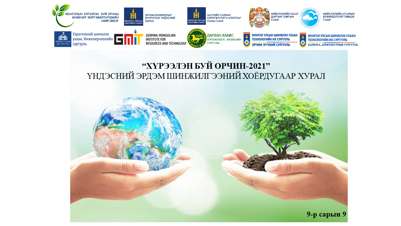 Дэлхийн Хүрээлэн буй орчны өдөрт зориулан “Хүрээлэн буй орчны инженерчлэл” сэдэвт оюутны эрдэм шинжилгээ, онол, практикийн бага хурлыг жил бүр зохион байгуулдаг уламжлалтай. “Хүрээлэн буй орчин-2021” үндэсний эрдэм шинжилгээний хоёрдугаар хурал өнгөрсөн долоо хоногт зохион байгуулагдаж /2021.9.9/ нийт 80 гаруй эрдэмтэн, судлаачид цахимаар оролцож үндсэн гурван хэсэгт хуваагдан 36 илтгэлийг хэлэлцүүлсэн байна.