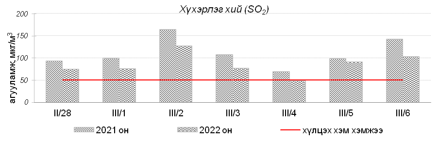 Улаанбаатар хотын агаарт түгээмэл бохирдуулах бодис хүхэрлэг хий /SO2/, азотын давхар исэл /NO2/, тоосонцор /PM10, PM2.5/, нүүрстөрөгчийн дутуу исэл /CO/, озон /O3/-ы агууламжийг тодорхойллоо.