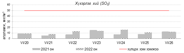 Улаанбаатар хотын агаарт түгээмэл бохирдуулах бодис хүхэрлэг хий /SO2/, азотын давхар исэл /NO2/, тоосонцор /PM10, PM2.5/, нүүрстөрөгчийн дутуу исэл /CO/, озон /O3/-ы агууламжийг тодорхойллоо.