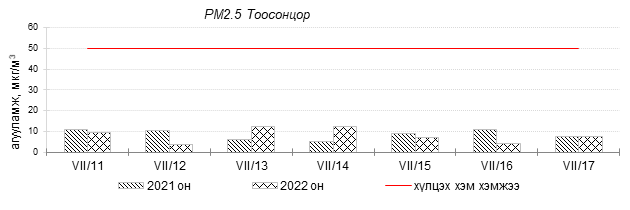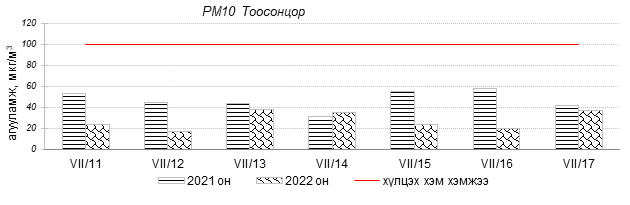 Өнгөрсөн 7 хоног буюу 2022 оны 7 дугаар сарын 11-ээс 17-ны өдрийн агаарын чанарын хяналт шинжилгээний дүнгээр Улаанбаатар хотын агаарын чанар 1-р хороолол, 100-н айл,, Нисэх, Зурагт, Хайлааст, 5-н буудал, 13-р хороолол, Баруун 4-н зам, Амгалан, Цахилгаан станц, Мишээл экспо, Зайсан, Ургах наран хороолол орчим “Цэвэр” болон “Хэвийн” түвшинд байсан байна. Дэлгэрэнгүйг эндээс үзнэ үү.