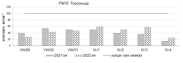 Өнгөрсөн 7 хоног буюу 2022 оны 8 дугаар сарын 29-өөс 9 дүгээр сарын 04-ний өдрийн агаарын чанарын хяналт шинжилгээний дүнгээр Улаанбаатар хотын агаарын чанар 1-р хороолол, Толгойт, Нисэх, Хайлааст, 5-н буудал, 13-р хороолол, Амгалан, Мишээл экспо, Зайсан, Ургах наран хороолол орчим “Цэвэр” болон “Хэвийн”, Зарим өдрүүдэд 100-н айл, Баруун 4-н зам орчим “Бага бохирдолтой” түвшинд хүрсэн байна. Дэлгэрэнгүйг эндээс үзнэ үү.