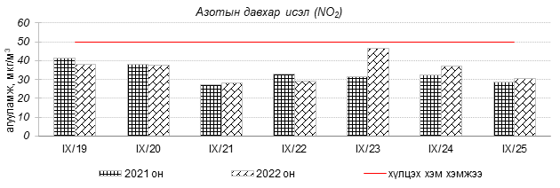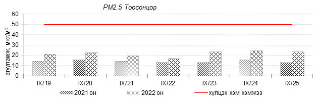 Өнгөрсөн 7 хоног буюу 2022 оны 9 дүгээр сарын 19-өөс 25-ны өдрийн агаарын чанарын хяналт шинжилгээний дүнгээр Улаанбаатар хотын агаарын чанар 1-р хороолол, Толгойт, Нисэх, Хайлааст, 5-н буудал, Шархад, 13-р хороолол, Мишээл экспо, Зайсан, Ургах наран хороолол орчим “Цэвэр” болон “Хэвийн”, зарим өдрүүдэд 100-н айл, Налайх, Баруун 4-н зам, Амгалан, Цахилгаан станц, “Бага бохирдолтой” түвшинд хүрсэн байна. Дэлгэрэнгүйг эндээс үзнэ үү.