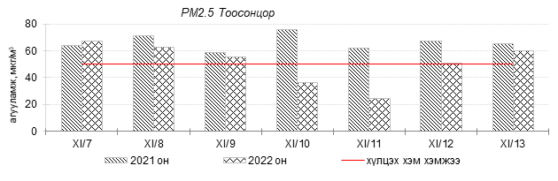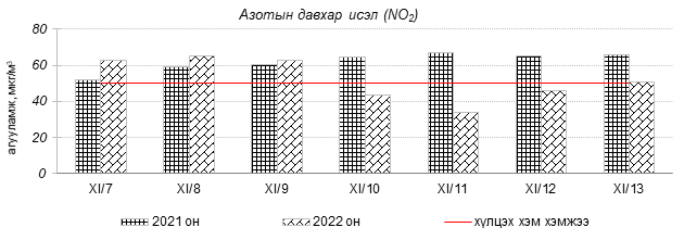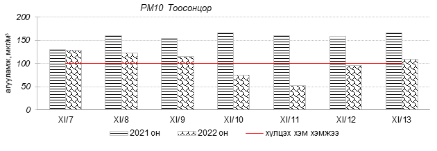 Өнгөрсөн 7 хоногийн буюу 2022 оны 11 дүгээр сарын 07-оос 13-ны өдрийн агаарын чанарын хяналт шинжилгээний дүнгээр Улаанбаатар хотын агаарын чанар Зайсан, Мишээл экспо орчим “Цэвэр” болон “Хэвийн”, Шархад, Налайх, 13-р хороолол, Ургах наран хороолол, 1-р хороолол, 100-н айл, Толгойт, Нисэх, Зурагт, Баянхошуу, Хайлааст, 5-н буудал, Баруун 4-н зам, Амгалан, Цахилгаан станц орчим “Бага бохирдолтой” түвшинд байсан байна. Дэлгэрэнгүйг эндээс үзнэ үү.