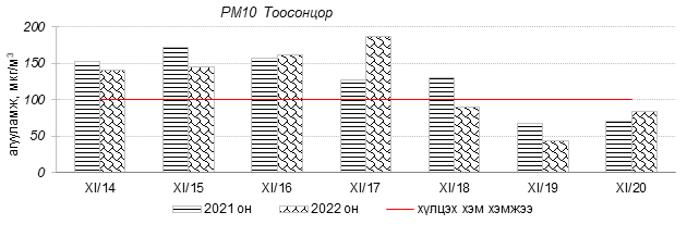 Өнгөрсөн 7 хоногийн агаарын чанарын хяналт шинжилгээний дүнгээр Улаанбаатар хотын агаарын чанар 2022 оны 11 дүгээр сарын 18-аас 20-ны өдрүүдэд 13-р хороолол, Цахилгаан станц, Зайсан, Мишээл экспо орчим “Цэвэр” болон “Хэвийн”, Шархад, Налайх, Ургах наран хороолол, 1-р хороолол, 100-н айл, Толгойт, Нисэх, Зурагт, Хайлааст, 5-н буудал, Баруун 4-н зам, Амгалан, орчим “Бага бохирдолтой”, Баянхошуу орчим “Бохирдолтой” түвшинд хүрсэн байна. Дэлгэрэнгүйг эндээс үзнэ үү.