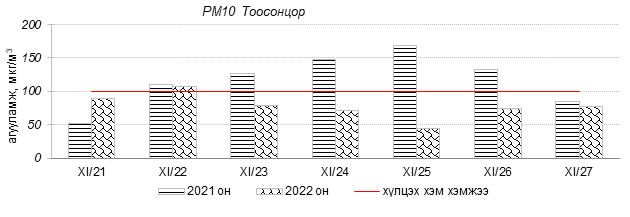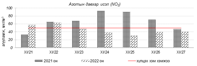 Өнгөрсөн 7 хоногийн агаарын чанарын хяналт шинжилгээний дүнгээр Улаанбаатар хотын агаарын чанар 2022 оны 11 дүгээр сарын 21-ээс 27-ны өдрүүдэд 13-р хороолол, Амгалан, Цахилгаан станц, Зайсан, Мишээл экспо, Ургах наран хороолол орчим “Цэвэр” болон “Хэвийн”, Шархад, Налайх, 1-р хороолол, 100-н айл, Толгойт, Нисэх, Зурагт, 5-н буудал, Баруун 4-н зам орчим “Бага бохирдолтой”, Баянхошуу, Хайлааст орчим “Бохирдолтой” түвшинд хүрсэн байна. Дэлгэрэнгүйг эндээс үзнэ үү.