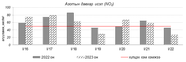 Өнгөрсөн 7 хоногийн агаарын чанарын хяналт шинжилгээний дүнгээр Улаанбаатар хотын агаарын чанар 2023 оны 01 дүгээр сарын 16-22-ны өдрүүдэд 100-н айл, Толгойт, Нисэх, 13-р хороолол, Баруун 4-н зам, Амгалан, Цахилгаан станц, Мишээл экспо, Зайсан, Ургах наран хороолол орчим “Бага бохирдолтой”, 1-р хороолол, Зурагт, Налайх орчим “Бохирдолтой”, Хайлааст, 5-н буудал, Шархад, Баянхошуу орчим “Их бохирдолтой” түвшинд хүрсэн байна. Дэлгэрэнгүйг эндээс үзнэ үү.