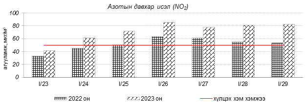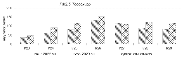 Өнгөрсөн 7 хоногийн агаарын чанарын хяналт шинжилгээний дүнгээр Улаанбаатар хотын агаарын чанар 2023 оны 01 дүгээр сарын 23-29-ний өдрүүдэд 100-н айл, Толгойт, Нисэх, 13-р хороолол, Баруун 4-н зам, Амгалан, Цахилгаан станц, Мишээл экспо, Зайсан, Ургах наран хороолол орчим “Бага бохирдолтой”, 1-р хороолол, Зурагт, 5-н буудал, Шархад, Налайх орчим “Бохирдолтой”, Хайлааст, Баянхошуу орчим “Их бохирдолтой” түвшинд хүрсэн байна. Дэлгэрэнгүйг эндээс үзнэ үү.
