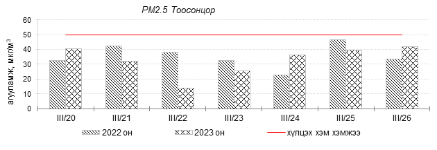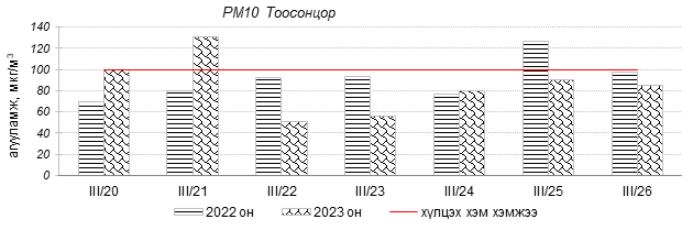 Улаанбаатар хотын агаарын чанар 2023 оны 03 дугаар сарын 20-26-ны өдрүүдэд Мишээл экспо, Зайсан, Ургах наран хороолол, Нисэх орчим цэвэр болон хэвийн, 1-р хороолол, 100-н айл, Толгойт, Зурагт, Хайлааст, 5-н буудал, 13-р хороолол, Баруун 4-н зам, Шархад, Налайх, Амгалан, Цахилгаан станц орчим “Бага бохирдолтой”, түвшинд байсан байна. Дэлгэрэнгүйг эндээс үзнэ үү.