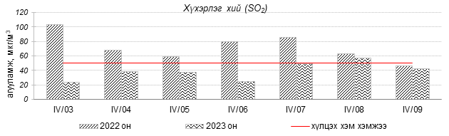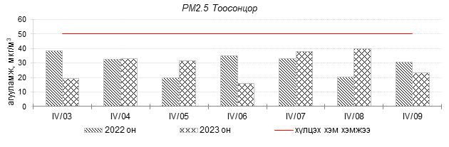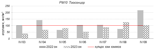Улаанбаатар хотын агаарын чанар 2023 оны 04 дүгээр сарын 03-09-ний өдрүүдэд Мишээл экспо, Зайсан, Ургах наран хороолол, 100-н айл, Зурагт орчим цэвэр болон хэвийн, Шархад, 5-н буудал, Нисэх 1-р хороолол, Толгойт, Хайлааст, 13-р хороолол, Баруун 4-н зам, Налайх, Баянхошуу, Амгалан орчим ихэнхдээ “Бага бохирдолтой” түвшинд байсан байна. Дэлгэрэнгүйг эндээс үзнэ үү.