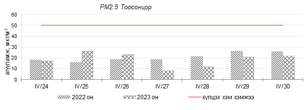 Улаанбаатар хотын агаарын чанар 2023 оны 04 дүгээр сарын 24-30-нд Нисэх, Зурагт, Шархад, Зайсан орчим цэвэр болон хэвийн, бусад цэгүүдэд буюу Хайлааст, Налайх, Мишээл экспо, Ургах наран хороолол 5-н буудал, 1-р хороолол, Толгойт, 13-р хороолол, Баруун 4-н зам, Баянхошуу, Амгалан 100-н айл орчим “Цэвэр”, “Хэвийн” зарим өдрүүдэд “Бага бохирдолтой” түвшинд байсан байна. Дэлгэрэнгүйг эндээс үзнэ үү.