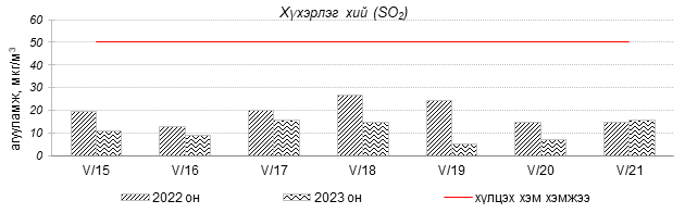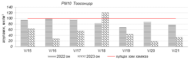 Улаанбаатар хотын агаарын чанар 2023 оны 05 дугаар сарын 15-21-нд Нисэх, Зурагт, Хайлааст, Шархад, Зайсан, Налайх, Мишээл экспо, Ургах наран хороолол 5-н буудал, 1-р хороолол, Толгойт, 13-р хороолол, Амгалан 100-н айл орчим “Цэвэр”, болон “Хэвийн”, Баруун 4-н зам орчим “Бага бохирдолтой” түвшинд байсан байна. Дэлгэрэнгүйг эндээс үзнэ үү.