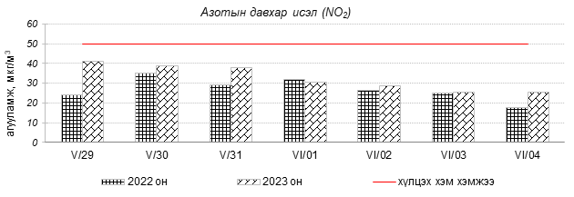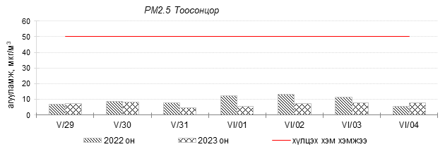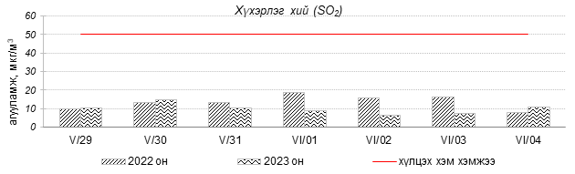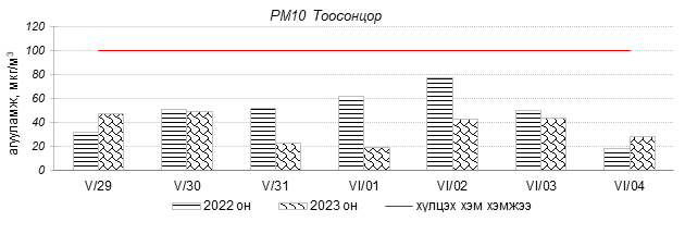 Улаанбаатар хотын агаарын чанар 2023 оны 05 дугаар сарын 29-өөс 06 дугаар сарын 04-ний өдрүүдэд Толгойт, Нисэх, Зурагт, Зайсан , 1-р хороолол, 100-н айл, Хайлааст, 5-н буудал, Шархад, Налайх, 13-р хороолол, Мишээл экспо, Ургах наран хороолол, Амгалан, Цахилгаан станц, Баянхошуу орчим “Цэвэр” болон “Хэвийн”, Баруун 4-н зам орчим “Бага бохирдолтой” түвшинд байсан байна. Дэлгэрэнгүйг эндээс үзнэ үү.