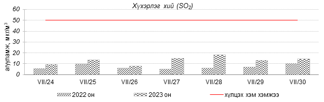 Улаанбаатар хотын агаарын чанар 2023 оны 07 дугаар сарын 24-30-ны өдрүүдэд Толгойт, Нисэх, Зурагт, Зайсан, Хайлааст, 5-н буудал, Шархад, Налайх, 1-р хороолол, ,13-р хороолол, Мишээл экспо, Ургах наран хороолол, орчим “Цэвэр” болон “Хэвийн”, 100-н айл, Баянхошуу, Баруун 4-н зам, Амгалан,Цахилгаан станц орчим “Бага бохирдолтой” түвшинд байсан байна. Дэлгэрэнгүйг доорх хавсралт файлаас үзнэ үү?