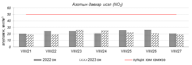 Улаанбаатар хотын агаарын чанар 2023 оны 08 дугаар сарын 21-27-нд Толгойт, Нисэх, Зурагт, Зайсан, Хайлааст, 5-н буудал, Шархад, Налайх, 1-р хороолол, 13-р хороолол, Мишээл экспо, Ургах наран хороолол, Амгалан, Цахилгаан станц, 100-н айл орчим “Цэвэр” болон “Хэвийн”, харин зарим өдрүүдэд Баруун 4-н зам орчим “Бага бохирдолтой” түвшинд хүрсэн байна. Дэлгэрэнгүйг эндээс үзнэ үү.
