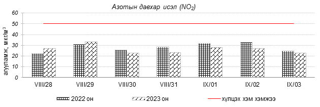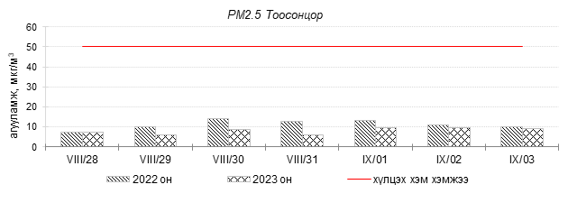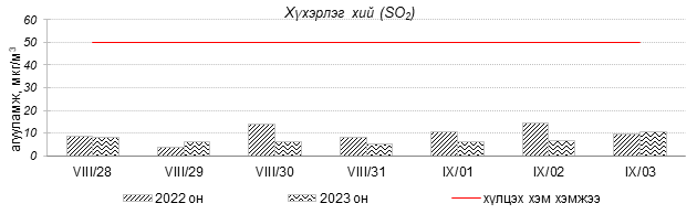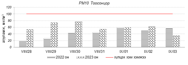 Улаанбаатар хотын агаарын чанар 2023 оны 08 дугаар сарын 28-аас 09 дүгээр сарын 03-нд Толгойт, Нисэх, Зурагт, Зайсан, Хайлааст, 5-н буудал, Шархад, Налайх, 1-р хороолол, 13-р хороолол, Мишээл экспо, Ургах наран хороолол, Амгалан орчим “Цэвэр” болон “Хэвийн”, харин 100-н айл, Баруун 4-н зам, Баянхошуу, Цахилгаан станц орчим “Бага бохирдолтой” түвшинд байсан байна. Дэлгэрэнгүйг эндээс үзнэ үү.