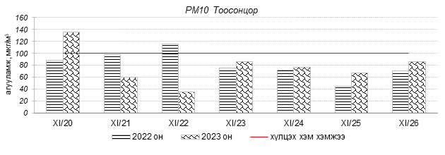 Улаанбаатар хотын агаарт түгээмэл бохирдуулах бодис хүхэрлэг хий /SO2/, азотын давхар исэл /NO2/, тоосонцор /PM10, PM2.5/, нүүрстөрөгчийн дутуу исэл /CO/, озон /O3/-ны агууламжийг тодорхойллоо.