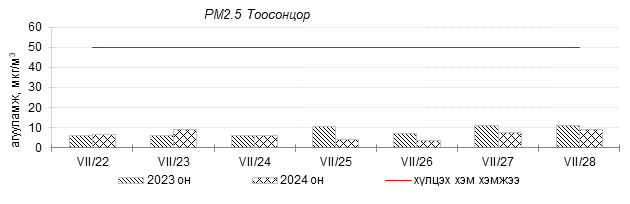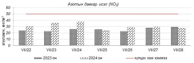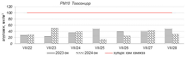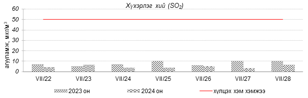 Улаанбаатар хотын агаарын чанарын индексийн мэдээгээр 2024 оны 07 дугаар сарын 22-28-ны өдрүүдэд Мишээл экспо, Толгойт, 1-р хороолол, 100-н айл, Нисэх, Баянхошуу, Дамбадаржаа, Шархад, Налайх, Хайлааст, 13-р хороолол, Ургах наран хороолол орчимд “Цэвэр” болон “Хэвийн”, харин зарим өдрүүдэд Зайсан, Баруун 4-н зам орчимд “Бага бохирдолтой” түвшинд хүрсэн байна.