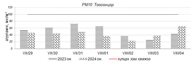 Улаанбаатар хотын агаарын чанарын индексийн мэдээгээр 2024 оны 07 дугаар сарын 29-өөс 08 дугаар сарын 04-ний өдрүүдэд Мишээл экспо, Толгойт, Зурагт, Нисэх, Дамбадаржаа, Шархад, Налайх, 1-р хороолол, Хайлааст, 13-р хороолол, 100-н айл, Ургах наран хороолол орчим “Цэвэр” болон “Хэвийн”, Зайсан, Баруун 4-н зам орчим “Бага бохирдолтой” түвшинд хүрсэн байна. Дэлгэрэнгүйг эндээс үзнэ үү.