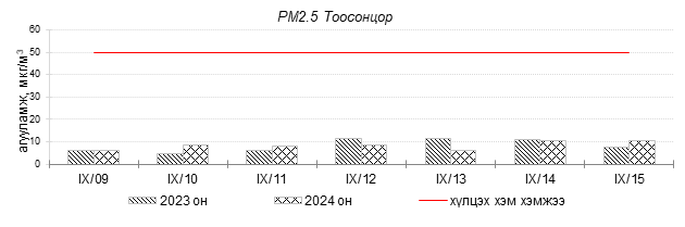 Улаанбаатар хотын агаарын чанарын индексийн мэдээгээр 2024 оны 09 дүгээр сарын 09-15-ны өдрүүдэд Мишээл экспо, Зайсан, Шархад, 13-р хороолол, Ургах наран хороолол, Толгойт, Дамбадаржаа, Зурагт, 5-н буудал, Нисэх, Баянхошуу, Налайх, Хайлааст орчим “Цэвэр” болон “Хэвийн”, харин 1-р хороолол, 100-н айл, Баруун 4-н зам орчим “Бохирдолтой” түвшинд хүрсэн байна. Дэлгэрэнгүйг эндээс үзнэ үү.