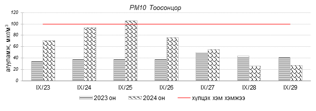 Улаанбаатар хотын агаарын чанарын индексийн мэдээгээр 2024 оны 09 дүгээр сарын 23-29-ний өдрүүдэд Мишээл экспо, Зайсан, 13-р хороолол, Ургах наран хороолол, Толгойт, Дамбадаржаа, Зурагт, Нисэх, Баянхошуу, Налайх, Шархад, 5-н буудал орчим “Цэвэр” болон “Хэвийн”, харин 1-р хороолол, 100-н айл, Хайлааст, Баруун 4-н зам, Цахилгаан станц орчим “Бага бохирдолтой” түвшинд байсан байна. Дэлгэрэнгүйг эндээс үзнэ үү.