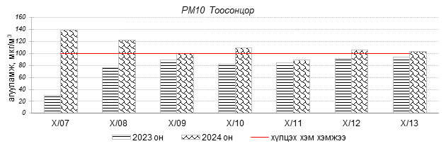 Улаанбаатар хотын агаарын чанарын индексийн мэдээгээр 2024 оны 10 дугаар сарын 07-13-ны өдрүүдэд Зайсан орчим “Хэвийн”, Нисэх, Зурагт, Мишээл экспо, Дамбадаржаа, 5-н буудал, Налайх, Шархад, 13-р хороолол, Ургах наран хороолол, Толгойт, 1-р хороолол, 100-н айл, Хайлааст, Баруун 4-н зам, Баянхошуу орчим “Бага бохирдолтой”, харин Цахилгаан станц орчим “Бохирдолтой” түвшинд хүрсэн байна. Дэлгэрэнгүйг эндээс үзнэ үү.