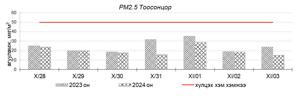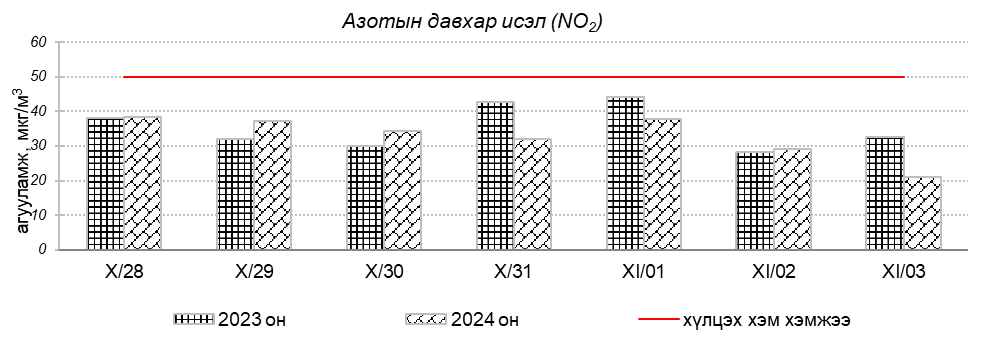 Улаанбаатар хотын агаарын чанарын индексийн мэдээгээр 2024 оны 10 дугаар сарын 28-аас 11 дүгээр сарын 03-ны өдрүүдэд Нисэх, Мишээл экспо, 13-р хороолол, Зайсан, Ургах наран хороолол орчим “Цэвэр” болон “Хэвийн”, Зурагт, 5-н буудал, Налайх, Амгалан, Дамбадаржаа, Шархад, Толгойт, 1-р хороолол, 100-н айл, Хайлааст, Баруун 4-н зам, Баянхошуу, орчим “Бага бохирдолтой”, харин Цахилгаан станц орчим “Их бохирдолтой” түвшинд хүрсэн байна. Дэлгэрэнгүйг эндээс үзнэ үү.