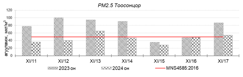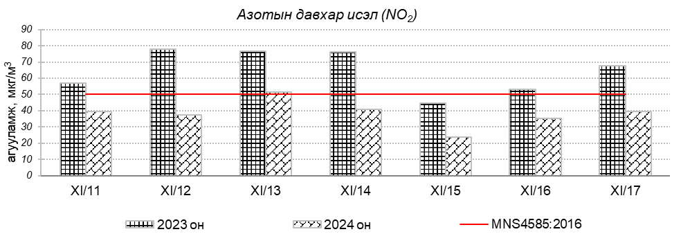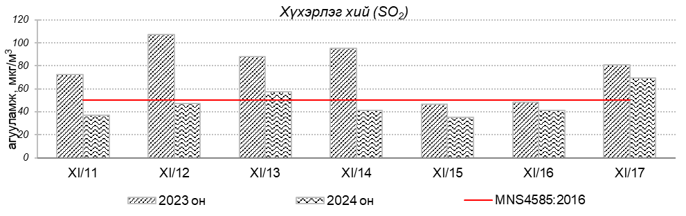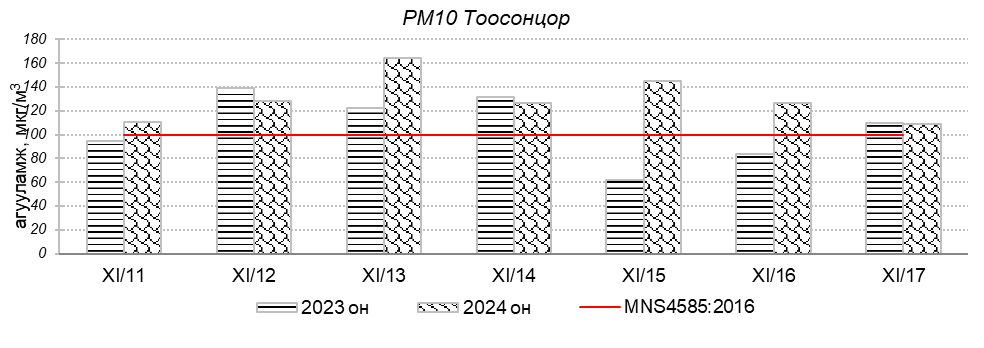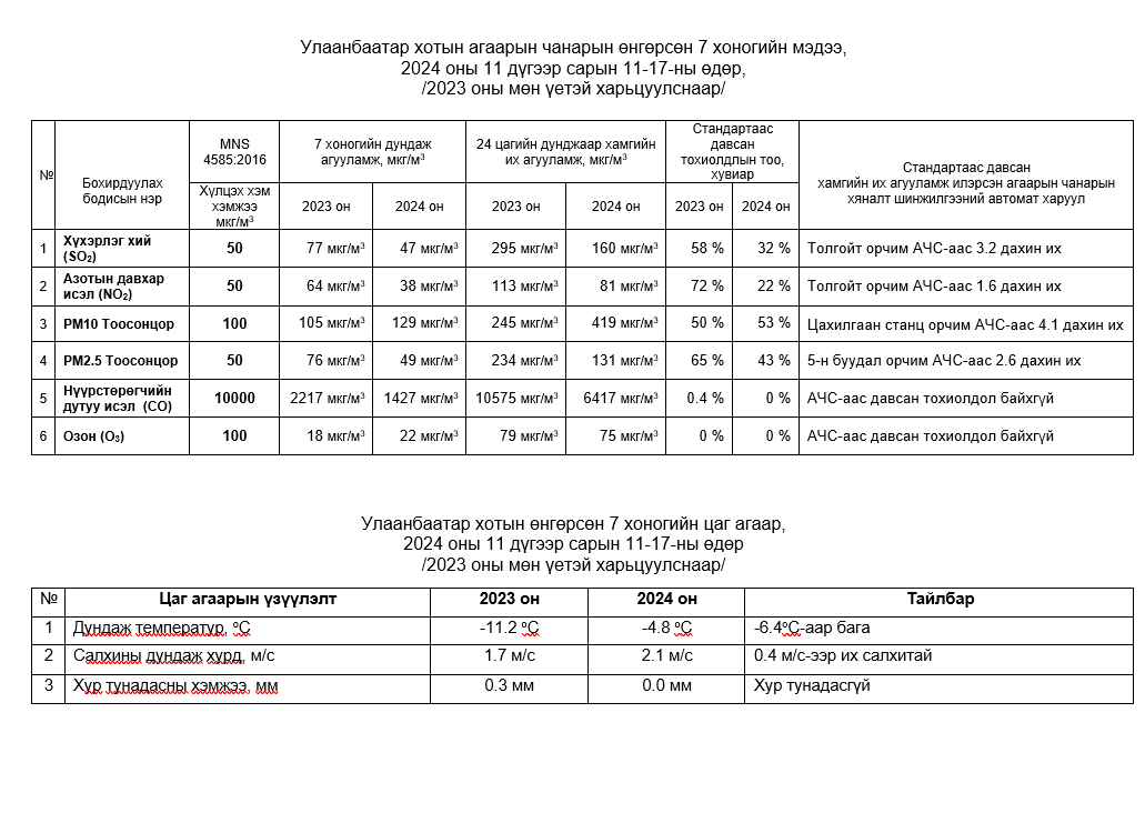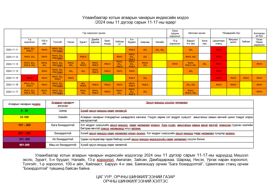 Улаанбаатар хотын агаарт түгээмэл бохирдуулах бодис хүхэрлэг хий /SO2/, азотын давхар исэл /NO2/, тоосонцор /PM10, PM2.5/, нүүрстөрөгчийн дутуу исэл /CO/, озон /O3/-ны агууламжийг тодорхойллоо.