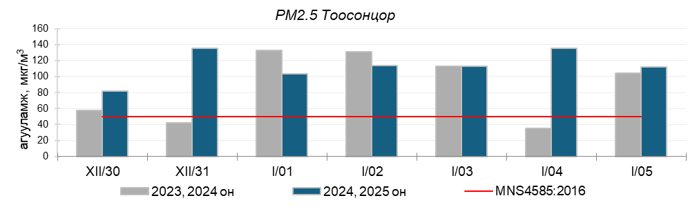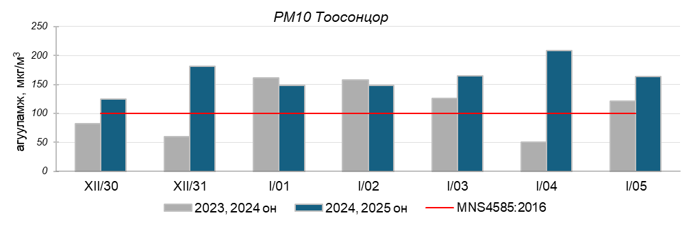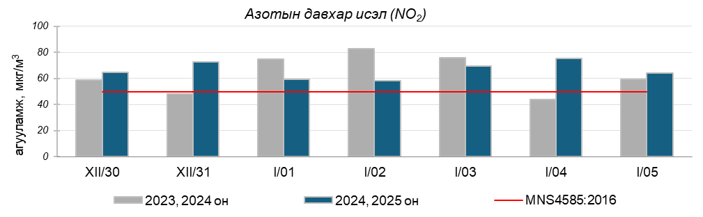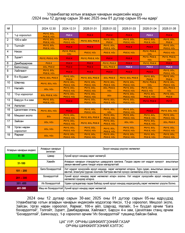 Улаанбаатар хотын агаарт түгээмэл бохирдуулах бодис хүхэрлэг хий /SO2/, азотын давхар исэл /NO2/, тоосонцор /PM10, PM2.5/, нүүрстөрөгчийн дутуу исэл /CO/, озон /O3/-ны агууламжийг тодорхойллоо.