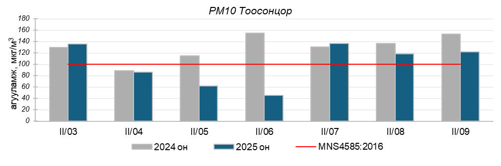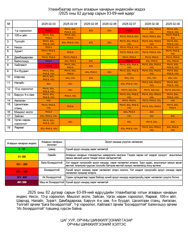 Улаанбаатар хотын агаарт түгээмэл бохирдуулах бодис хүхэрлэг хий /SO2/, азотын давхар исэл /NO2/, тоосонцор /PM10, PM2.5/, нүүрстөрөгчийн дутуу исэл /CO/, озон /O3/-ны агууламжийг тодорхойллоо.
