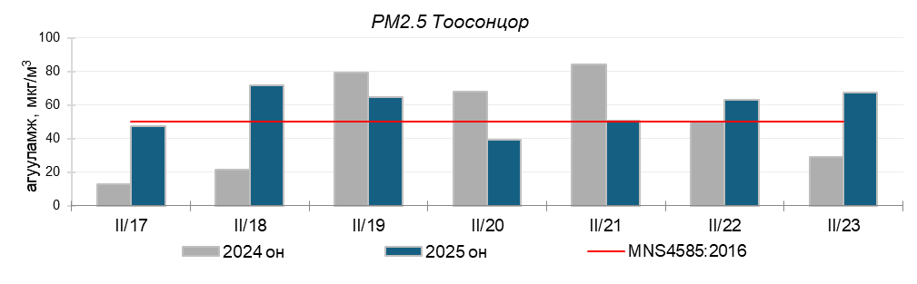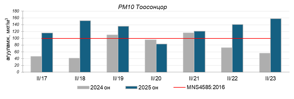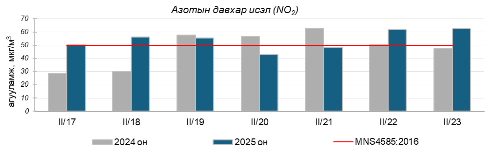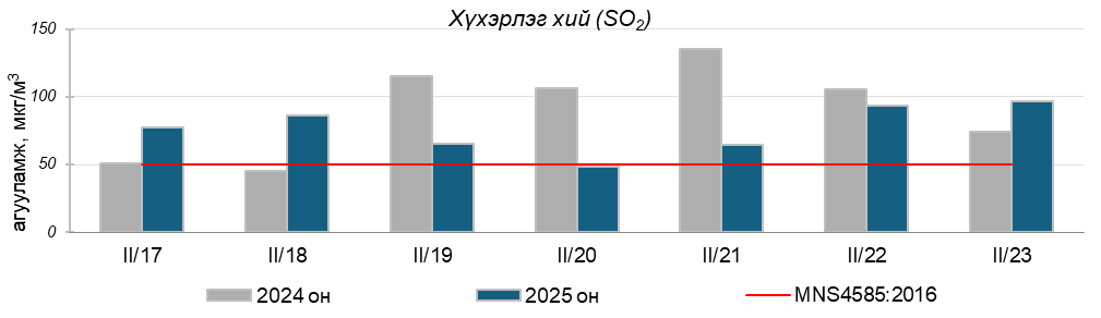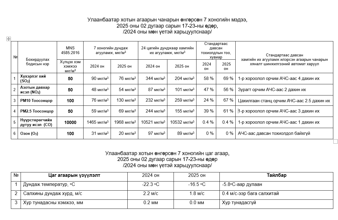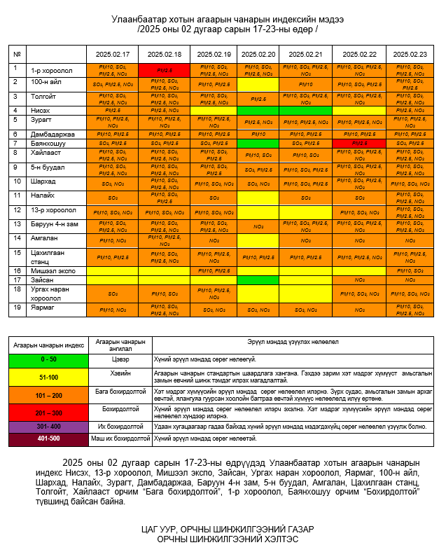 Улаанбаатар хотын агаарт түгээмэл бохирдуулах бодис хүхэрлэг хий /SO2/, азотын давхар исэл /NO2/, тоосонцор /PM10, PM2.5/, нүүрстөрөгчийн дутуу исэл /CO/, озон /O3/-ны агууламжийг тодорхойллоо.