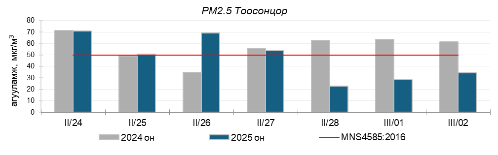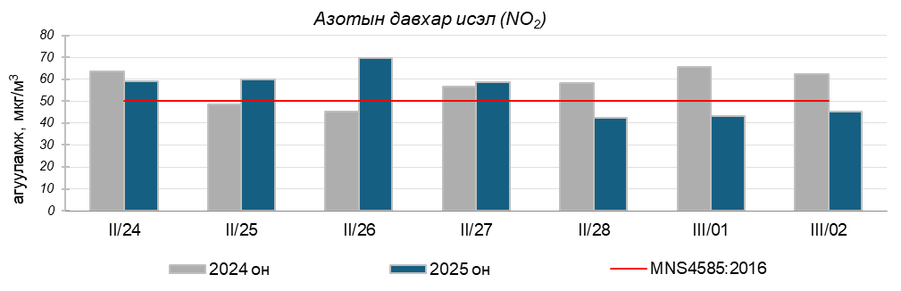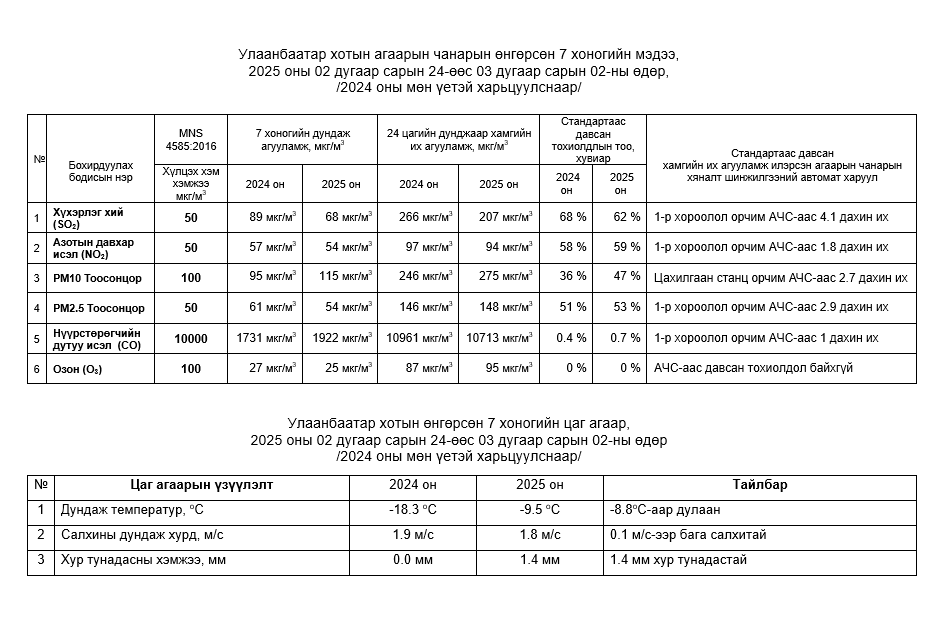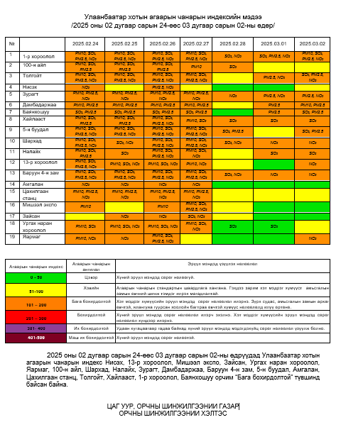 Улаанбаатар хотын агаарт түгээмэл бохирдуулах бодис хүхэрлэг хий /SO2/, азотын давхар исэл /NO2/, тоосонцор /PM10, PM2.5/, нүүрстөрөгчийн дутуу исэл /CO/, озон /O3/-ны агууламжийг тодорхойллоо.