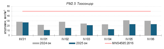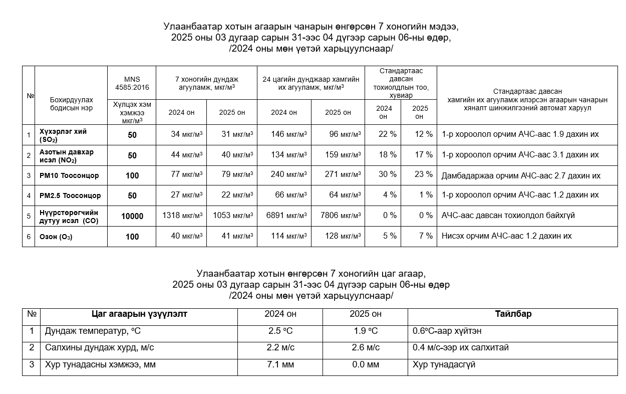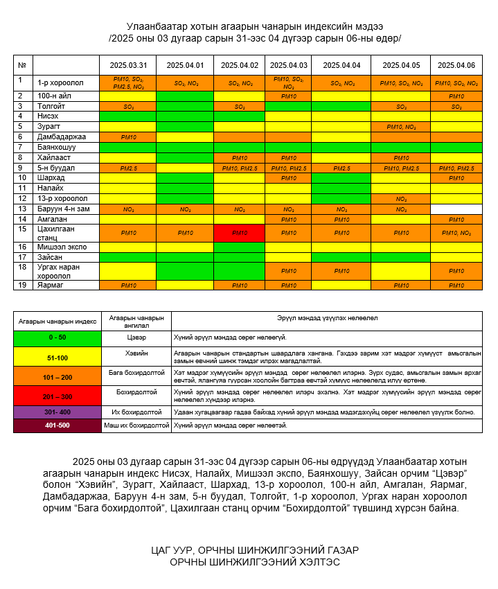 Улаанбаатар хотын агаарт түгээмэл бохирдуулах бодис хүхэрлэг хий /SO2/, азотын давхар исэл /NO2/, тоосонцор /PM10, PM2.5/, нүүрстөрөгчийн дутуу исэл /CO/, озон /O3/-ны агууламжийг тодорхойллоо.
