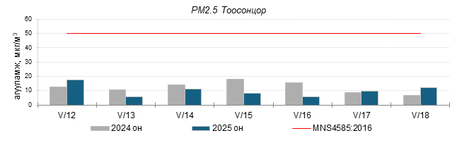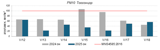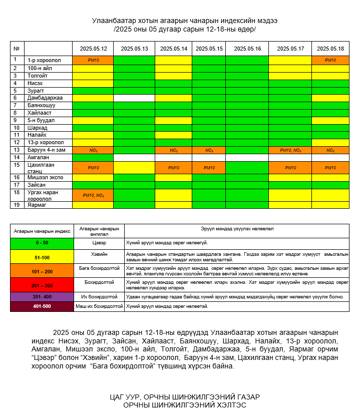 Улаанбаатар хотын агаарт түгээмэл бохирдуулах бодис хүхэрлэг хий /SO2/, азотын давхар исэл /NO2/, тоосонцор /PM10, PM2.5/, нүүрстөрөгчийн дутуу исэл /CO/, озон /O3/-ны агууламжийг тодорхойллоо.