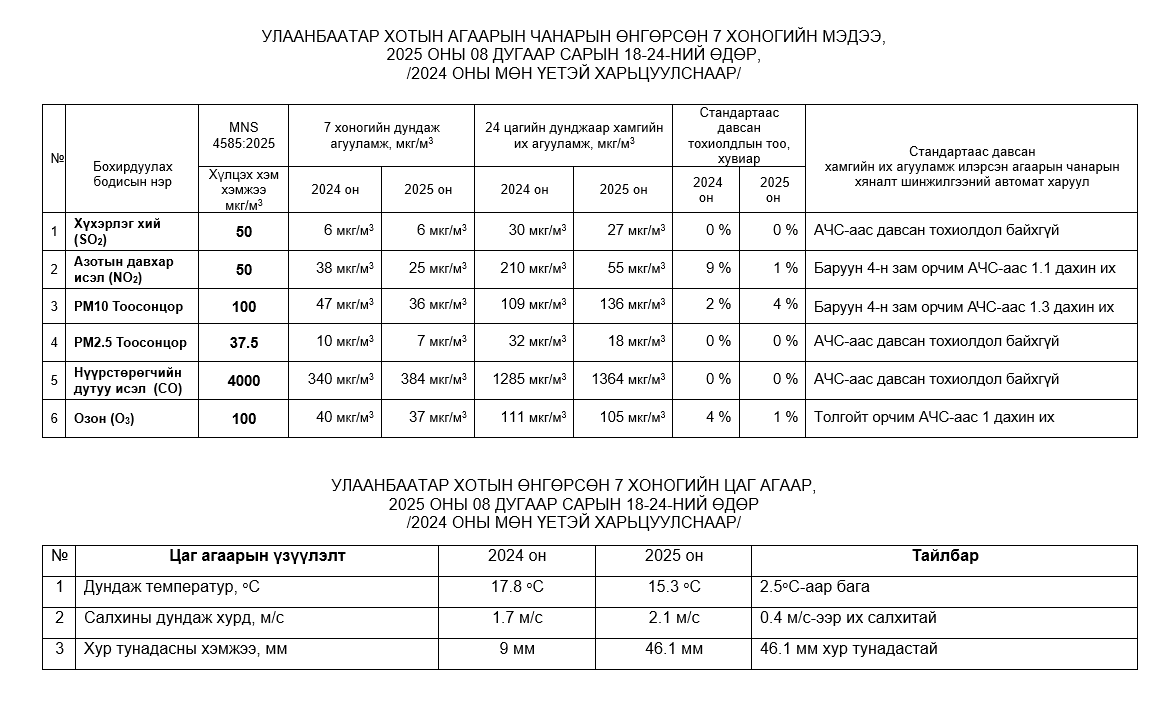 Улаанбаатар хотын агаарт түгээмэл бохирдуулах бодис хүхэрлэг хий /SO2/, азотын давхар исэл /NO2/, тоосонцор /PM10, PM2.5/, нүүрстөрөгчийн дутуу исэл /CO/, озон /O3/-ны агууламжийг тодорхойллоо.