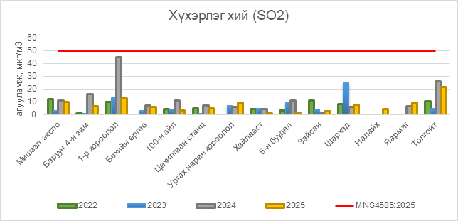 2025 оны 09 дүгээр сарын 16-ны өдрийн байдлаар хүхэрлэг хий (SO2) нь бүх цэгүүдэд MNS4585:2025 АЧС-аас даваагүй байна.