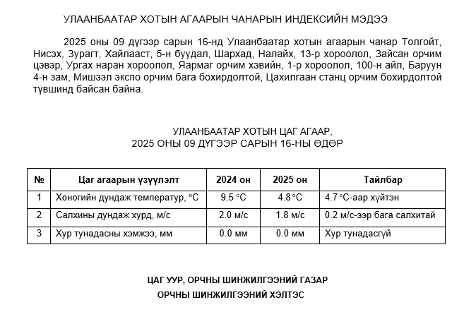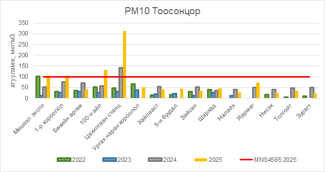 2025 оны 09 дүгээр сарын 16-ны өдрийн байдлаар РМ10 тоосонцор нь Мишээл экспо орчим АЧС-аас 5 мкг/м3 –ээр их, 1-р хороолол орчим АЧС-аас 5 мкг/м3 –ээр их, 100-н айл орчим АЧС-аас 32 мкг/м3 –ээр их, Цахилгаан станц орчим АЧС-аас 213 мкг/м3 –ээр их, бусад цэгүүдэд MNS4585:2025 АЧС-аас даваагүй байна.