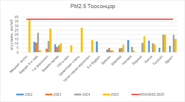2025 оны 09 дүгээр сарын 16-ны өдрийн байдлаар РМ2.5 тоосонцор нь бүх цэгүүдэд MNS4585:2025 АЧС-аас даваагүй байна.