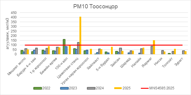 2025 оны 09 дүгээр сарын 18-ны өдрийн байдлаар РМ10 тоосонцор нь Цахилгаан станц орчим АЧС-аас 305 мкг/м3 –ээр их, Яармаг орчим АЧС-аас 52 мкг/м3 –ээр их, бусад цэгүүдэд MNS4585:2025 АЧС-аас даваагүй байна.