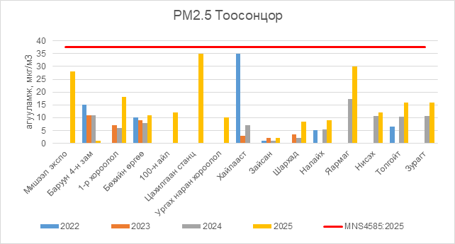 2025 оны 09 дүгээр сарын 18-ны өдрийн байдлаар РМ2.5 тоосонцор нь бүх цэгүүдэд MNS4585:2025 АЧС-аас даваагүй байна.