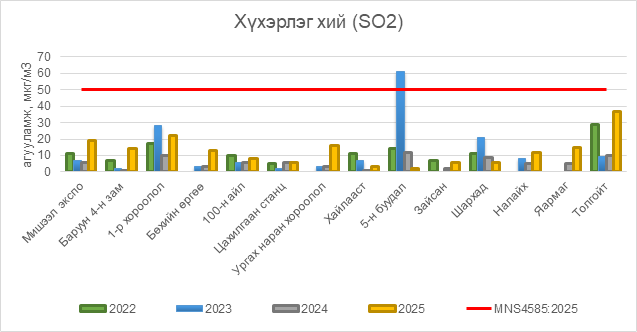 2025 оны 09 дүгээр сарын 29-ний байдлаар хүхэрлэг хий (SO2) нь бүх цэгүүдэд MNS 4585:2025 АЧС-аас даваагүй байна.