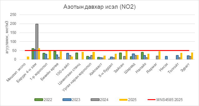 2025 оны 09 дүгээр сарын 29-ний байдлаар азотын давхар исэл (NO2) нь Баруун 4-н зам орчим АЧС-аас 13 мкг/м3 –ээр их, Зайсан орчим АЧС-аас 1 мкг/м3 –ээр их, бусад цэгүүдэд MNS 4585:2025 АЧС-аас даваагүй байна.
