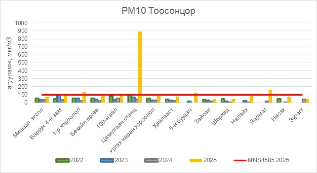 2025 оны 09 дүгээр сарын 29-ний байдлаар РМ10 тоосонцор нь 1-р хороолол орчим АЧС-аас 36 мкг/м3 –ээр их, Цахилгаан станц орчим АЧС-аас 793 мкг/м3 –ээр их, 5-н буудал орчим АЧС-аас 28 мкг/м3 –ээр их, Яармаг орчим АЧС-аас 61 мкг/м3 –ээр их, бусад цэгүүдэд MNS 4585:2025 АЧС-аас даваагүй байна.