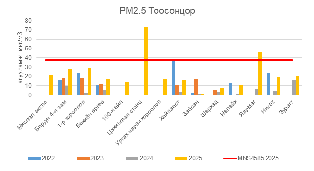 2025 оны 09 дүгээр сарын 29-ний байдлаар РМ2.5 тоосонцор Цахилгаан станц орчим АЧС-аас 35.5 мкг/м3 –ээр их, Яармаг орчим АЧС-аас 8.5 мкг/м3 –ээр их, бусад цэгүүдэд MNS 4585:2025 АЧС-аас даваагүй байна.