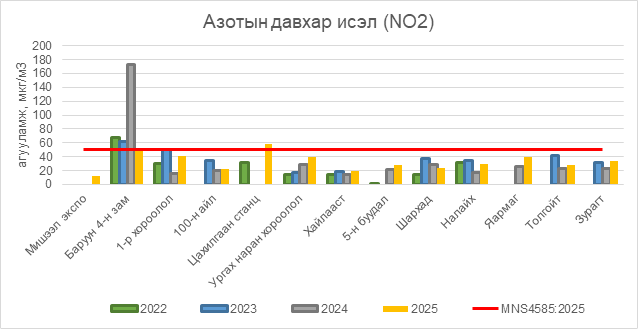 2025 оны 09 дүгээр сарын 30-ны өдрийн байдлаар азотын давхар исэл (NO2) нь Баруун 4-н зам орчим АЧС-аас 3 мкг/м3 –ээр их, Цахилгаан станц орчим АЧС-аас 8 мкг/м3 –ээр их, бусад цэгүүдэд MNS 4585:2025 АЧС-аас даваагүй байна.