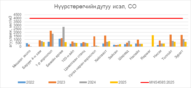 2025 оны 09 дүгээр сарын 30-ны өдрийн байдлаар нүүрстөрөгчийн дутуу исэл (СО) нь бүх цэгүүдэд MNS4585:2025 АЧС-аас даваагүй байна.