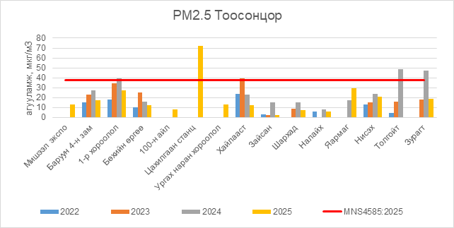 2025 оны 10 дугаар сарын 01-ний байдлаар РМ2.5 тоосонцор нь Цахилгаан станц орчим АЧС-аас 34.5 мкг/м3 –ээр их, бусад цэгүүдэд MNS 4585:2025 АЧС-аас даваагүй байна.