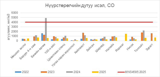 2025 оны 10 дугаар сарын 01-ний байдлаар нүүрстөрөгчийн дутуу исэл (СО) нь бүх цэгүүдэд MNS4585:2025 АЧС-аас даваагүй байна.