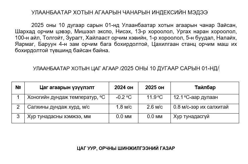 2025 оны 10 дугаар сарын 01-ний байдлаар РМ10 тоосонцор нь 1-р хороолол орчим АЧС-аас 5 мкг/м3 –ээр их, Цахилгаан станц орчим АЧС-аас 724 мкг/м3 –ээр их, 5-н буудал орчим АЧС-аас 70 мкг/м3 –ээр их, Налайх орчим АЧС-аас 12 мкг/м3 –ээр их, Яармаг орчим АЧС-аас 19 мкг/м3 –ээр их, бусад цэгүүдэд MNS 4585:2025 АЧС-аас даваагүй байна.