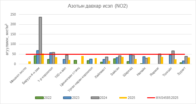 2025 оны 10 дугаар сарын 08-ны байдлаар азотын давхар исэл (NO2) нь Баруун 4-н зам орчим АЧС-аас 3 мкг/м3 –ээр их, бусад цэгүүдэд MNS 4585:2025 АЧС-аас даваагүй байна.