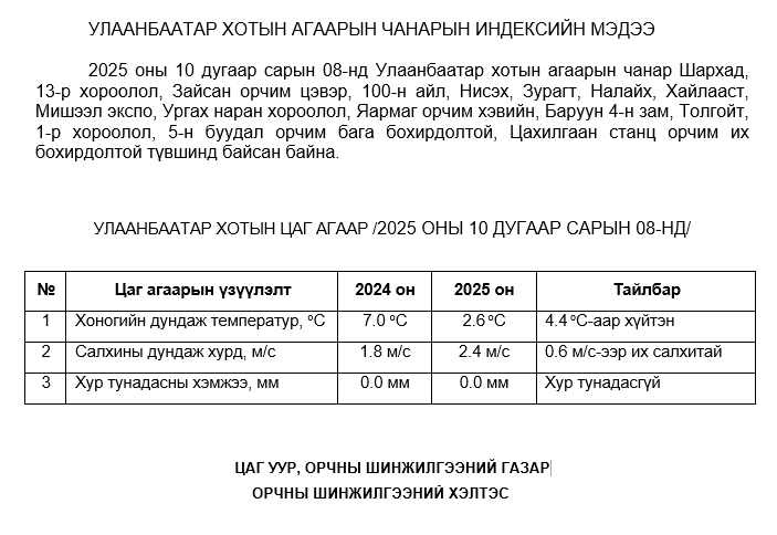 2025 оны 10 дугаар сарын 08-ны байдлаар хүхэрлэг хий (SO2) нь 5-н буудал орчим АЧС-аас 9 мкг/м3 –ээр их, Толгойт орчим АЧС-аас 5 мкг/м3 –ээр их, бусад цэгүүдэд MNS 4585:2025 АЧС-аас даваагүй байна.